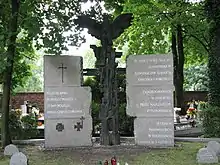 A number of Polish individuals were arrested following the German capture of the city.[4] While some were reported to have been released, others were taken to the German consulate and executed shortly afterward by a firing squad.[4] Those executed included the approximately 30 surviving defenders of the Silesian Insurgent House.[3][5] Some estimates suggested that the number of fatalities in Katowice might have been as high as 750.[7][8] However, the Polish Institute of National Remembrance (IPN) which investigated this incident noted that about 150 Poles were killed in Katowice on that day in fighting and subsequent executions, and that it is impossible to precisely determine the total number of fatalities, nor to separate exactly the number of fatalities that occurred as a result of fighting and those that occurred as a result of later executions.[3][5] The number of individuals executed through the firing squad is estimated at about 80 fatalities.[2][5] The victims of the execution consisted not only of those who were arrested for actively fighting German soldiers and surrendered, but also of individuals simply wearing scouting or militia uniform, people in possession of firearms or ammunition, or civilians selected by German sympathizers as persons of special interest. Only the individuals who had documents identifying them as soldiers in the Polish Army were spared and treated according to the prisoners of war conventions.[5] The victims of the executions included at least one woman and fourteen boy scouts aged approximately 14 years old.[5] Among the victims was the, former insurgent and later councilman of the Katowice city council, and one of the militia leaders Nikodem Renc .[9] A hard to estimate number of people, at least a dozen, were executed in Katowice in the following days in various incidents.[5]