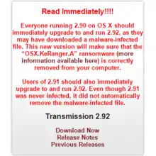 KeRanger is remotely executed on the victim's computer from a compromised installer for Transmission, a popular BitTorrent client downloaded from the official website. It is hidden in the .dmg file under General.rtf. The .rtf is actually a Mach-O format executable file packed with UPX 3.91. When users click these infected apps, their bundle executable Transmission.app/Content/MacOS/Transmission will copy this General.rtf file to ~/Library/kernel_service and execute this “kernel_service” before any user interface appearing.[1] It encrypts the files with RSA and RSA public key cryptography, with the key for decryption only stored on the attacker's servers. The malware then creates a file, called "readme_to_decrypt.txt", in every folder. When the instructions are opened, it gives the victim directions on how to decrypt the files, usually demanding a payment of one bitcoin. The ransomware is considered to be a variant of the Linux ransomware Linux.Encoder.1.[2]