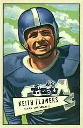 Keith Duane Flowers (April 24, 1930 – November 12, 1993) was an American football player who played one season in the National Football League with the Detroit Lions and Dallas Texans. He was drafted by the Detroit Lions in the eleventh round of the 1952 NFL Draft. He played college football at Texas Christian University and attended Perryton High School in Perryton, Texas.[1]