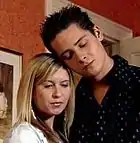 On-screen, the characters moved into a flat together, worked together, and fought over the same boys. In December 2003, EastEnders made headlines in the UK press, after they screened a lesbian kiss between Kelly and Zoe. The storyline was featured in a special New Year's Eve episode that was filmed on-location in Scotland. In the storyline, a group of teenagers had travelled from London to Scotland for New Year's Eve; however, the minibus they were driving crashed, leaving them stranded and injured on the freezing cold Scottish moors.[3] While stranded, Kelly cared for an injured Zoe, they became overemotional, and kissed. Kinsella has explained the reasons behind the kiss: "They're stuck in the hills, thinking they're going to die - it's a way of saying goodbye and also of showing how much they love each other as friends. Which is quite sweet really."[4] She claims that the lesbian kiss was made easier, due to the fact that she was kissing her off-screen best friend: "That made it so much easier. We thought we were just going to be laughing and giggling the whole way through, but we were very professional. It was so cold that we just wanted to get it over with. We were shaking from cold - not from nerves - and it was raining, so we just thought, 'Let's do it and get it done with'. I was really scared but it was fine. Now it just seems like a dream, I can't really remember it. We laugh about it now. When it came down to it, the truth was that it was just like any other screen kiss.[4] The episode featuring the lesbian kiss attracted 9.5 million viewers, and the precise moment that they kissed was watched by 44% of the available viewing audience.[5]