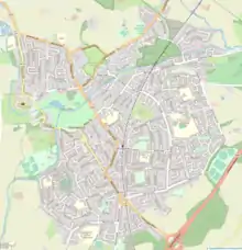 Kenilworth (/ˈkɛnɪlwərθ/ KEN-il-wərth) is a market town and civil parish in Warwickshire, England; it is situated approximately 6 miles (10 km) south-west of central Coventry, 5 miles (8 km) north of Warwick and 90 miles (140 km) north-west of London. It lies on Finham Brook, a tributary of the River Sowe, which joins the River Avon about 2 miles (3 km) north-east of the town centre. The 2011 Census recorded a parish population of 22,413.[1] The town is noted architecturally for the extensive ruins of Kenilworth Castle, the ruins of Kenilworth Abbey in Abbey Fields park, St Nicholas's Parish Church and the town's clock tower.