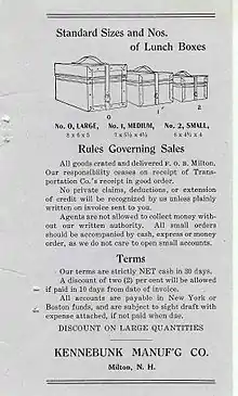 The Kennebunk Manufacturing Company (KEMACO) was incorporated in Maine on July 23, 1893 with John R. Littlefield of Boston, Mass., President and J. B. Lara of Kennebunk, Me., Treasurer. The purpose of the Company was the “manufacturing and dealing in cases, boxes, valises, grips, and trunks.”[1] The name, “Kennebunk Manufacturing Company” was the same name as that of an ill fated company that had tried to build a cotton mill at Kennebunk in 1825 and failed by 1828.[2] [3] The new Kennebunk Manufacturing Company merged with another Kennebunk manufacturer of similar travel items known as the Travelet Company after 1895.[4] The merged companies were purchased by J. Spaulding & Sons Company in 1902 and its operations were moved to Milton, New Hampshire where they occupied the old N.B. Thayer & Co, shoe factory until 1936. [5] [6] While in Milton the Kennebunk Manufacturing Company, manufactured megaphones, radio speaker horns and violin cases in addition to its original line of lunch boxes and suit and sample cases.