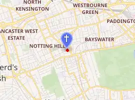 The present church building was founded as Horbury Chapel, and used by the Hornton Street Congregational church, Notting Hill, in 1849.[1] The building was purchased in 1930 by George Jeffreys.[2] This became the Bible-Pattern Church Fellowship, Elim's flagship church, becoming Kensington Temple, Church of the Foursquare Gospel in 1935.[3]