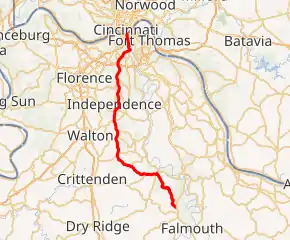 KY 17 begins at an intersection with U.S. Route 27 (US 27) in unincorporated Pendleton County, approximately 4 miles (6.4 km) north of Falmouth. The road heads north with a slight bend to the west. The road takes a sharp turn west with an intersection with KY 467 in DeMossville. The road then heads in a western/northwestern direction, up to Walton, where it meets KY 14. Having picked up the name Madison Pike at the Kenton County line several miles south of KY 14, it heads north toward Independence. Approcaching Independence, the road intersects KY 16, where that highway undergoes a name change: it is known as Walton–Nicholson Road to the west of KY 17, and Taylor Mill Road to the east of KY 17. KY 17 was rerouted to the south of downtown Independence. The old section of KY 17 continues through the heart of Independence, containing landmarks such as Simon Kenton High School and the Kenton County Courthouse where it is now called KY 17 Business. Just north of downtown Independence, KY 17 transitions from a two-lane road to a four-lane divided highway. The name "Madison Pike" stays with the older road that KY 17 was formerly routed along until 2002, and the split occurs at the corner where Summit View Elementary and Middle Schools are located. KY 17 picks up the name "Madison Pike" again when the old road meets up with the current route a little over 2 miles (3.2 km) north. KY 17 passes a park named "Pioneer Park" as it continues north, to its intersection with Interstate 275 (I-275). The road then continues north into Covington. Less than 1 mile (1.6 km) north of its intersection with KY 16, Holmes High School is located on the east side of KY 17. The road then continues north to the Ohio River, where it crosses the river along the John A. Roebling Suspension Bridge. Now in Cincinnati, Ohio, the route terminates near US 52.