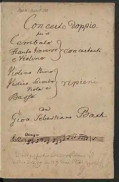 The harpsichord part in the autograph manuscript is not a "fair copy" but a composing score with numerous corrections. The orchestral parts on the other hand were executed as a fair copy.[2][4] Various possible explanations have been proposed as to why Bach assembled the collection of harpsichord concertos at this particular time. One centres on his role as director of the Collegium Musicum in Leipzig, a municipal musical society, which gave weekly concerts at the Café Zimmermann, drawing many performers from students at the university. Bach served as director from spring 1729 to summer 1737; and again from October 1739 until 1740 or 1741. John Butt suggests that the manuscript was prepared for performances on Bach's resumption as director in 1739, additional evidence coming from the fact that the manuscript subsequently remained in Leipzig.[5] Peter Wollny, however, considers it unlikely that The Collegium Musicum would have required orchestral parts that were so neatly draughted; he considers it more plausible that the manuscript was prepared for a visit that Bach made to Dresden in 1738 when he would almost certainly have given private concerts in court (or to the nobility) and the ripieno parts would have been played by the resident orchestra.[2][6] Peter Williams has also suggested that the collection would have been a useful addition to the repertoire of his two elder sons, Wilhelm Friedemann and Carl Philipp Emanuel, both employed as professional keyboard-players at the time of writing. Williams has also speculated that it might not be mere coincidence that the timing matched the publication of the first ever collection of keyboard concertos, the widely acclaimed and well-selling Organ concertos, Op.4 of George Frederic Handel published in London and Paris in 1738.[7]