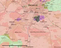 ![]() Map of Damascus in October 2016. The Western Ghouta rebel pocket is in the southwest. | |||||||