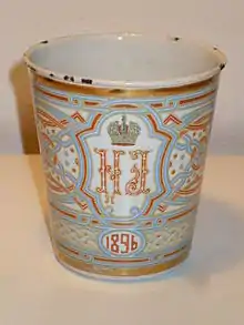 The Khodynka Cup of Sorrows, also known as the Coronation Cup, the Sorrow Cup, or the Blood Cup, was made for the coronation of Tsar Nicholas II and Tsarina Alexandra Feodorovna in 1896. The cup bears the cyphers of Nicholas and Alexandra surrounded by a geometric pattern with the Romanov eagle on the opposite side.