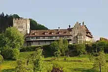 After the outbreak of the First War of Kappel, Prince Abbot Kilian fled to Meersburg in 1529. From February 1530 onwards, he lived at Wolfurt Castle near Bregenz.[3] In exile at Lake Constance, he maintained relations with the Southern German nobility in order to exert political pressure on the reformation movement in the prince abbot's lands, which did not escape reformer Vadian.[4] In 1530, he represented the prince abbey at the hearing (dt. “Tagsatzung”) in Baden. In July 1530, Prince abbot Kilian Germann visited the Diet of Augsburg. In the same year, after a visit from Count Montfort, he fell from his horse and drowned in the Bregenzer Ach.[2] He was entombed at the Territorial Abbey of Wettingen-Mehrerau near Bregenz.[5] His successor as Prince abbot of Saint Gall was Diethelm Blarer von Wartensee.[6]