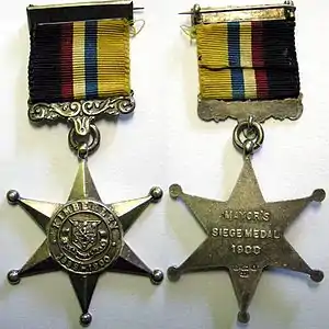 The reverse is plain and is inscribed, in relief, "MAYOR'S SIEGE MEDAL 1900" in three lines, with the silver hallmark impressed at the top of the lowermost star point. The medals were awarded unnamed, although some were unofficially engraved with the name of the recipient.[2][3][7][10]
