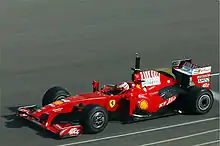 Räikkönen went on to take his 16th pole position in France, which was the 200th pole for Scuderia Ferrari.[44] Räikkönen dominated the race as he set the fastest lap and had a six-second lead until a bank exhaust failure some halfway through the race reduced his engine's power. He gave up the lead to his teammate Massa, but was far enough ahead of Toyota's Jarno Trulli, to secure second place and eight points.[45]