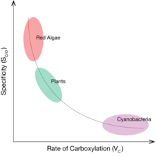 It has been observed among natural RuBIsCOs that an increased ability to distinguish between CO2 and O2 (larger values of Sc/o) corresponds with a decreased rate of carboxylation (lower values of VC and KC).[18] The variation and trade-off between Sc/o and KC has been observed across all photosynthetic organisms, from photosynthetic bacteria and algae to higher plants.[18] Organisms using RuBisCOs with high values of VC / KC, and low values of Sc/o have localized RuBisCO to areas within the cell with artificially high local CO2 concentrations. In cyanobacteria, concentrations of CO2 are increased using a carboxysome, an icosahedral protein compartment about 100 nm in diameter that selectively uptakes bicarbonate and converts it to CO2 in the presence of RuBisCO.[19] Organisms without a CCM, like certain plants, instead utilize RuBisCOs with high values of Sc/o and low values of VC and KC.[18] It has been theorized that groups with a CCM have been able to maximize KC at the expense of decreasing Sc/o, because artificially enhancing the concentration of CO2 would decrease the concentration of O2 and remove the need for high CO2 specificity. However, the opposite is true for organisms without a CCM, who must optimize Sc/o at the expense of KC because O2 is readily present in the atmosphere.