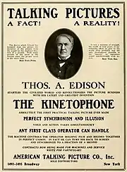 In 1913, Edison finally introduced the new Kinetophone—like all of his sound-film exhibition systems since the first in the mid-1890s, it used a cylinder phonograph, now connected to a Projecting Kinetoscope via a fishing line–type belt and a series of metal pulleys.[91] While it met with great acclaim in the short term, poorly trained operators had trouble keeping picture in synchronization with sound and, like other sound-film systems of the era, the Kinetophone had not solved the issues of insufficient amplification and unpleasant audio quality. Its drawing power as a novelty soon faded and when a fire at Edison's West Orange complex in December 1914 destroyed all of the company's Kinetophone image and sound masters, the system was abandoned.[92]