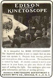 A prototype for the Kinetoscope was shown to a convention of the National Federation of Women's Clubs on May 20, 1891.[2] The first public demonstration of the Kinetoscope was held at the Brooklyn Institute of Arts and Sciences on May 9, 1893.[2] Instrumental to the birth of American movie culture, the Kinetoscope also had a major impact in Europe; its influence abroad was magnified by Edison's decision not to seek international patents on the device, facilitating numerous imitations of and improvements on the technology. In 1895, Edison introduced the Kinetophone, which joined the Kinetoscope with a cylinder phonograph. Film projection, which Edison initially disdained as financially nonviable, soon superseded the Kinetoscope's individual exhibition model. Many of the projection systems developed by Edison's firm in later years would use the Kinetoscope name.