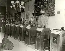 On April 14, 1894, a public Kinetoscope parlor was opened by the Holland Bros. in New York City at 1155 Broadway, on the corner of 27th Street—the first commercial motion picture house. The venue had ten machines, set up in parallel rows of five, each showing a different movie. For 25 cents a viewer could see all the films in either row; half a dollar gave access to the entire bill.[51] The machines were purchased from the new Kinetoscope Company, which had contracted with Edison for their production; the firm, headed by Norman C. Raff and Frank R. Gammon, included among its investors Andrew M. Holland, one of the entrepreneurial siblings, and Edison's former business chief, Alfred O. Tate. The ten films that comprise the first commercial movie program, all shot at the Black Maria, were descriptively titled: Barber Shop, Bertoldi (mouth support) (Ena Bertoldi, a British vaudeville contortionist), Bertoldi (table contortion), Blacksmiths, Roosters (some manner of cock fight), Highland Dance, Horse Shoeing, Sandow (Eugen Sandow, a German strongman managed by Florenz Ziegfeld), Trapeze, and Wrestling.[52] As historian Charles Musser describes, a "profound transformation of American life and performance culture" had begun.[50]