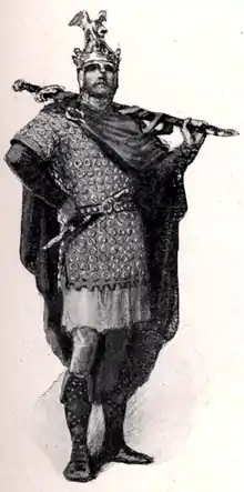 The romances' Loholt (Lohot) usually appears as a son by Guinevere in the works such as Lanzelet (as Ilinot/Elinot) and Perlesvaus, but in the Vulgate Cycle he is Arthur's illegitimate son by Lyzianor (Lionors).[14][24][25] He is treacherously killed by Kay so that the latter can take credit for the defeat of the giant Logrin in Perlesvaus,[26] and dies from illness after his rescue from the Dolorous Prison by Lancelot in the Vulgate.[25] Thomas Malory renamed him as Borre (Bohart, Boarte) le Cure Hardy, apparently conflating him with another character from the French texts.