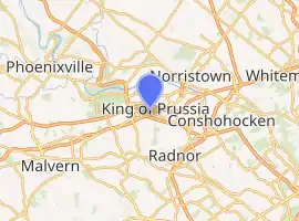 The King of Prussia mall is located in the census-designated place of King of Prussia,[4] in Upper Merion Township, Montgomery County, Pennsylvania, 20 miles (32 km) northwest of Philadelphia. The mall is near the convergence of four major highways: the Schuylkill Expressway (Interstate 76), the Pennsylvania Turnpike (Interstate 76/Interstate 276), U.S. Route 202, and U.S. Route 422.[5][6] The mall is located northeast of the Schuylkill Expressway and south of the Pennsylvania Turnpike on the north side of US 202 between Gulph Road to the southwest and Allendale Road to the northeast, with Mall Boulevard providing access to and running through the mall grounds between Gulph Road and US 202. Mall Boulevard passes under a portion of the shopping mall. Ramps to and from the westbound direction of the Schuylkill Expressway connect to Mall Boulevard.[5][7] SEPTA Suburban Division bus routes 92, 99, 123, 124, 125, and 139 serve the King of Prussia Mall at the King of Prussia Transit Center. These bus routes provide service to West Chester, the Exton Transportation Center at the Exton Square Mall, the Norristown Transportation Center, Phoenixville, the 69th Street Transportation Center, Center City Philadelphia, Chesterbrook, Valley Forge, and Limerick.[8] The Greater Valley Forge Transportation Management Association operates The Rambler, a community shuttle around Upper Merion Township that has two stops at the King of Prussia mall.[9] A branch of SEPTA's Norristown High Speed Line called the King of Prussia Spur is proposed to serve the mall via two stations.[10]