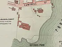 In 1865 Thomas Lawry died at the age of 44.[15] The death notice records that the name of the house was still Sophienberg. Two years later in 1867 Esther married James Taylor.[16] who was the Commissary-General of Ordnance. This couple then lived in the House with Esther’s two children one of whom was Thomas Terry Trewyn Lawry. In 1891 James Taylor died.[17] By this time the house had been named “Kirribilli” and was located in Campbell Street as the map on the left shows. In 1900 Esther died.[18] and the house was left to her son Thomas Terry Trewyn Lawry.