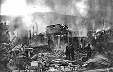 The newly built town proved highly vulnerable to fire. Houses were made of wood, heated with stoves and lit by candles and oil lamps; water for emergencies was wanting, especially in the frozen winters.[212] The first major fire occurred on November 25, 1897, started accidentally by dance-hall girl Belle Mitchell.[213] She also accidentally started a second major fire on October 14, 1898, which, in the absence of a fire brigade in Dawson, destroyed two major saloons, the post-office building and the Bank of British North America at a cost of $500,000 ($14,000,000).[214][215][n 31] The worst fire occurred on April 26, 1899, when a saloon caught fire in the middle of a strike by the newly established fire brigade.[216] Most of the major landmarks in the town were burned to the ground: 117 buildings were destroyed, with the damage estimated at over $1 million ($28,000,000).[217][218][n 32]