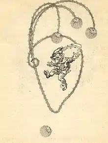 Kobolds may manifest as animals, fire, human beings, and objects.[29] Fiery kobolds are also called drakes, draches, or puks. A tale from the Altmark, recorded by Anglo-Saxon scholar Benjamin Thorpe in 1852, describes the kobold as "a fiery stripe with a broad head, which he usually shakes from one side to the other..."[37] A legend from the same period taken from Pechüle, near Luckenwald, says that the kobold flies through the air as a blue stripe and carries grain. "If a knife or a fire-steel be cast at him, he will burst, and must let fall what which he is carrying."[38] Some legends say the fiery kobold enters and exits a house through the chimney.[39] Legends dating to 1852 from western Uckermark ascribe both human and fiery features to the kobold; he wears a red jacket and cap and moves about the air as a fiery stripe.[38] Such fire associations, along with the name drake, may point to a connection between kobold and dragon myths.[39]