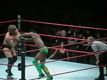 A series of vignettes for Kingston's television debut began airing on the weekly ECW on Syfy television show starting on December 6, 2007.[27] During this introduction phase, his videos, the official website and commentators noted he would be the first Jamaican to wrestle for WWE but he does not have any Jamaican ancestry, nor any connection to Jamaica.[lower-alpha 1][17][29] He is, however, the first African-born performer in WWE history. He debuted on the January 22, 2008 ECW as a face with a win over local wrestler David Owen in Charlottesville, Virginia.[30] After wrestling sporadic matches, Kingston was involved in his first major match, a 24-man battle royal during the WrestleMania XXIV pre-show with the winner receiving an ECW Championship match, but was eliminated by Mark Henry.[31] Kingston remained undefeated in singles competition in ECW for months and was placed into a feud with Shelton Benjamin at the end of April 2008. After two straight losses, Benjamin got a win over Kingston on the May 20 ECW, ending his undefeated streak.[32] On the June 24 ECW, Kingston defeated Benjamin in an Extreme Rules match to end their feud.[33]