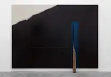 During the 1980s and 1990s, Enokura continued to explore the act of staining on cotton-fabric. In these works, which are titled Intervention or Intervention (Story) and are numbered sequentially, the artist typically contrasted smooth fields of black paint with unpainted fabric, sometimes drenching the entire surface. In several canvases he used oil-soaked beams of lumber to mark the fabric—either affixing the beams to the work or leaning them against it.