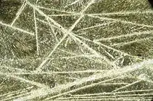 Harrisite texture, first described from intrusive rocks (not komatiites) at Harris Bay on the island of Rùm in Scotland, is formed by nucleation of crystals on the floor of a magma chamber.[12][13] Harrisites are known to form megacrystal aggregates of pyroxene and olivine up to 1 metre in length.[14] Harrisite texture is found in some very thick lava flows of komatiite, for example in the Norseman-Wiluna Greenstone Belt of Western Australia, in which crystallization of cumulates has occurred.[15]