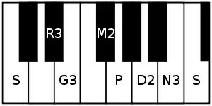 - ārohaṇa: S R₃ G₃ M₂ P D₂ N₃ Ṡ[lower-alpha 1]
