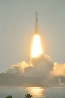 Kounotori 3 was launched aboard H-IIB rocket from Tanegashima Space Center at 02:06:18 UTC (11:06:18 JST) on 21 July 2012. The rocket flew smoothly arching out over the Pacific Ocean on a southeasterly trajectory 51.66° titled to the Equator. Two minutes after liftoff, the four strap-on solid rocket boosters separated from the launch vehicle and fell away in pairs as planned.[10] The second stage then ignited and continued the push Kounotori 3 to orbit. Four minutes into the flight the H-IIB jettisoned the payload fairing and the first stage. After igniting the second stage engine, the H-IIB inserted Kounotori 3 into its preferred initial orbit with separation confirmed at 14 minutes and 53 minutes after liftoff.[11] Following the successful separation of Kounotori 3, the second stage engines were re-ignited for another time to perform a controlled re-entry test.[12] The second stage dropped into the South Pacific Ocean shortly afterwards. There were no apparent launch problems during the entire flight of the H-IIB rocket.