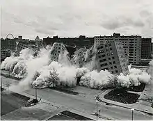 Time-lapse photography of shadows of clouds are seen moving across the skyscrapers, followed by shots of various housing projects in disrepair, including footage of the decay and demolition of the Pruitt-Igoe housing project in St. Louis. The sequence ends with footage of the destruction of large buildings. A time-lapse shot of a crowd of people who appear to be waiting in a line. This is followed by shots of people walking along streets in slow motion.