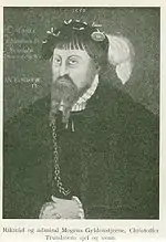 After moving to Trondheim around 1527 he became something of a right hand for archbishop Olav Engelbrektsson, the last catholic archbishop in Norway, and was a loyal support of his until 1537.[4] Some have speculated that Kristoffer possibly was the nephew of Olav Engelbrektsson, primarily supported by a somewhat ambiguous source in which Mary of Austria, Queen of Hungary call Kristoffer his blutverwonter frundt ("relative by blood"),[5] although the theory have been assisted by further circumstances.
