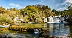 Skradinski buk is one of the most attractive parts of the park. It is a massive, clear, natural pool with high waterfalls at one end and cascades at the other. It is the lowest of the three sets of waterfalls formed along the Krka river. In an area 400 m in length and 100 m in width there are 17 waterfalls and the total difference in height between the first and the last falls is 47.7 m. Due to the wealth and variety of geomorphological forms, vegetation, and the various effects caused by the play of light on the whirlpools, Skradinski buk is considered to be one of the most beautiful calcium carbonate waterfalls in Europe.[2]