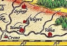In the 15th century, a small settlement started to establish itself around the Kruonis' manor of the Grand Duke of Lithuania. The first church was built in Kruonis by Kazimieras Jogailaitis in 1472. It was built in the Catholic cemetery, using wood. Current Catholic church is located in the building which was built as a Uniate church in 1626 by the colonel of the Grand Duchy of Lithuania, distinguished in the battles with the Muscovy, Cossacks and Livonia, subcamerarius of Trakai Teodoras Bohdanas Oginskis (1568–1640).[2] It was a first Uniate church in Lithuania – its architecture is a rare blend of the styles of Lithuanian Renaissance and Byzantine architecture. In 1628–1629, by the church a monastery of Basilian monks was established.[3] In the beginning of the 17th century, the palatial Renaissance manor was built, but did not survive up to this day, except some ruins – it was badly damaged in 1812 during Napoleonic Wars. The people of Kruonis were active participants of the January Uprising. Many of them after deported to the remote territories in Russia and were replaced by the colonists from Russia which were transferred to Kruonis. The Catholic church was closed in 1866 and demolished by Russian authority as a reaction to January Uprising. In the beginning of the 20th century cultural and social life revived – a branch of Lithuanian Catholic Women Society (Lietuvių katalikių moterų draugija) established in 1913, Lithuanian spectacles were shown, Kruonis had a choir.