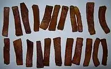 Krupuk kulit (Javanese: rambak or Minangkabau: karupuak jangek, lit:"skin crackers") is a traditional Indonesian cattle skin krupuk (cracker).[2] Traditionally it is made from the soft inner skin of cattle (cow or water buffalo), diced, and sun-dried until it hardens and loses most of its water content. The diced and dried skin are later fried in ample hot cooking oil until they expand in similar fashion with bubble and yield a crispy texture. This fried cattle skin is then sealed in vacuum plastic bags to ensure and prolong its crispiness.