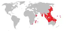 The bluespotted stingray is commonly found in waters of depths about 0–90 meters (0–295 feet), being commonly found in sand and mudflats, but have also been encountered near rocky coral reefs, and sea grass beds. This stingray is found in a tropical climate at 29°N- 31°S, and 20°E- 171°W.[6] At high tide the bluespotted stingray moves into the shallow lagoons and reef flats.[5] It is found in northern Australia, Kenya, Madagascar, The island of Mauritius, Somalia, the east coast of South Africa, India. The bluespotted stingray is in almost the entire continental waters of Asia, including the Sea of Japan, Yellow Sea, East China Sea, Philippine Sea, Sulu Sea, Java Sea, Banda Sea, Celebes Sea, Andaman Sea, the Bay of Bengal and the Arabian Sea.[11]