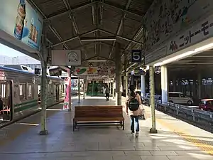 The JR East station consists of two ground-level island platforms, serving four tracks for the Takasaki Line, with an elevated station building above the platforms. Shinkansen services are provided by one side platform and one island platform serving three tracks, located above the station building. The station has a “Midori no Madoguchi” staffed ticket office.