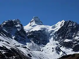 Kunturiri (Aymara kunturi condor,[2] -(i)ri a suffix, Hispanicized spelling Condoriri) is a mountain in the Cordillera Real of Bolivia, about 5,648 metres (18,530 ft) high. It is also the name of the whole massif.[3] Kunturiri is located in the La Paz Department, Los Andes Province, Pukarani Municipality,[4] southeast of Chachakumani and northwest of Huayna Potosí.
