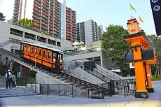 Chazelle scouted for "old L.A." locations that were in ruins, or were perhaps razed. One such example was the use of the Angels Flight trolley, built in 1901. The funicular had been closed in 2013 after a derailment. Attempts were made to repair and re-open the railway, but to no avail. However, the production team was able to secure permission to use it for a day. Chazelle and his crew then arranged to have it run for shooting (it was re-opened to the public in 2017).[11] Mia works at a coffee shop on the Warner Bros. studio lot; Chazelle considered studio lots to be "monuments" of Hollywood. Production designer Wasco created numerous fake old film posters. Chazelle occasionally created names for them, deciding to use the title of his first feature, Guy and Madeline on a Park Bench (2009) for one poster, which reimagines it as a 1930s musical.[11]
