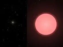 The angular diameter of La Superba has been measured at 13.81 mas.[15] It is expected to be pulsating but this has not been seen in the measurements. At 230 pc, this corresponds to a radius of 1.59 astronomical units (342 R☉).[lower-alpha 1] If it were placed at the position of the Sun, the star's surface would extend beyond the orbit of Mars.
