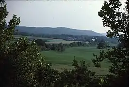 Slateford Junction, looking north to the Delaware Water Gap. The Cut-Off (left) and the Old Road (right) converge about 1,500 ft (460 m) past the obscured Slateford Tower.