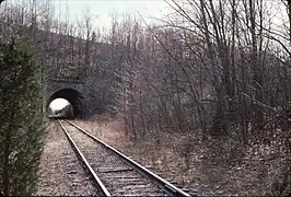 Roseville Tunnel posed occasional problems, especially during the winter with snow and ice buildup. Rockslides were a constant threat west of the tunnel. In recognition of this, a detector fence was installed west of Roseville Tunnel in 1950 to change trackside signals to red if rocks fell.[19] The most serious rockslide to ever occur on the line, however, would take place within Armstrong Cut (just west of Johnsonburg) in 1941, closing the line for nearly a month, and causing trains to be rerouted via the Old Road.[20] The north side of Armstrong Cut was trimmed back to prevent further rockslides.[20]