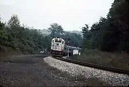 The DL&W was one of the most profitable corporations in the U.S. when it built the Cut-Off.[4][28] That profitability declined sharply after World War II, leading to the 1960 merger with the Erie Railroad.[29] DL&W single-tracked the Cut-Off in 1958 in anticipation of the Erie merger. The westbound track was removed, leaving a four-mile (6.4 km) passing siding at Greendell and shorter sidings at Port Morris and Slateford. After the merger, most freight traffic shifted to the Erie's mainline through Port Jervis, New York.[30][31] With the cessation of passenger service in 1970, the Cut-Off became relatively quiet for several years. In 1972, the CNJ abandoned operations in Pennsylvania, causing through freights to be run daily between Elizabeth, New Jersey, and Scranton, using the Cut-Off and the CNJ's High Bridge Branch. (This arrangement with the CNJ would end on April 1, 1976, with the creation of Conrail).[31] As such, when Penn Central closed its Maybrook, New York Yard in 1970, the original reason for using the "Erie side" suddenly no longer existed. As a result, the EL looked to upgrade the "Scranton side", and by 1974 nearly all EL freights had been re-routed to the Scranton Division via the Cut-Off.[31]