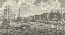 Lafayette and his entourage landed at Castle Clinton where an enormous military escort had been assembled to usher him along Broadway and to the New York City Hall, where he was to be greeted by Mayor Stephen Allen, a route lined by upwards of 50,000 people (about one-third of the city's population at the time).[2] The marquis' secretary, Auguste Levasseur, described the landing ceremony and parade in a journal he kept of the tour:[3]