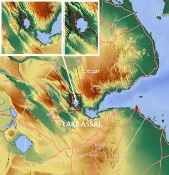 Lake Assal (Arabic: بحيرة عسل Buḥayrah ʿAsal, (questionable etymology; more likely “Lake of Salt” creole from French Colonial Period); is a crater lake in central-western Djibouti. It is located at the western end of Gulf of Tadjoura in the Tadjoura Region, touching Dikhil Region, at the top of the Great Rift Valley, some 120 km (75 mi) west of Djibouti city. Lake Assal is a saline lake that lies 155 m (509 ft) below sea level in the Afar Triangle, making it the lowest point on land in Africa and the third-lowest point on Earth after the Sea of Galilee and the Dead Sea. No outflow occurs from the lake, and due to high evaporation, the salinity level of its waters is 10 times that of the sea, making it the third most saline body of water in the world behind Don Juan Pond and Gaet'ale Pond.[1][2][3][4][5] Lake Assal is the world's largest salt reserve, which is exploited under four concessions awarded in 2002 at the southeast end of the lake; the major share of production (nearly 80%) is held by Société d’Exploitation du Lac and Société d’Exploitation du Salt Investment S.A de Djibouti.[5]