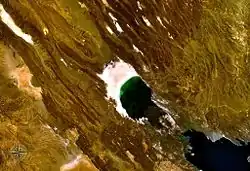 Water temperature of the lake is reported to reach 33–34 °C.[7] However, when the wind velocity is low and evaporation also low, the temperature recorded was found to be 20 °C for surface water and above 25 °C at shallow depths of the lake.[5][6][10][11] The lake water colour also changes over the duration of the day, at times appearing in fluorescent colours.[8] In the middle of the day, the water looks unusual with its emerald color on the background of the snow-white shore.[12]