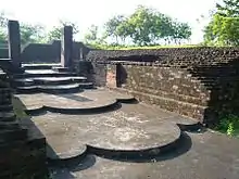 Another interesting find is that of an east facing apsidal chaityagriha, built of bricks, 33 by 11 metres (108 ft × 36 ft) in size with 3.3 metres (11 ft)-thick walls. This edifice, the first such Buddhist structure found in Odisha, contains a circular stupa at its center. Also found were a series of Kushana Brahmi inscriptions made on shells with cuts on moonstone at the periphery of the edifice. Another find is a piece of a pillar railing with a lens-shaped decoration with the theme of a half lotus medallion. From these finds it is inferred that such structures belonged from the early Christian era to 6th–7th century period.[2]