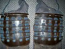 A lame is a solid piece of sheet metal used as a component of a larger section of plate armor. Multiple lames are riveted together or connected by leather straps or cloth lacing to form an articulated piece of armor that provides flexible protection. The armor worn by the samurai class of feudal Japan used lames in the construction of many of their individual armor parts.[1]