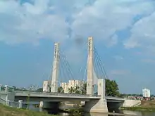 The Lane Avenue Bridge is a cable-stayed bridge over the Olentangy River in the American city of Columbus, Ohio. Designed by Jones-Stuckey Ltd., the construction was completed on November 14, 2003, after only sixteen months, five months ahead of schedule. The bridge is 113 meters (371 feet) in length, carrying six 3.5 meters (11 feet) wide lanes for vehicle traffic, as well as two 3.5 meter sidewalks. The cable stayed design was chosen for aesthetic reasons, as well as having a smaller potential for environmental degradation on the river environment. The anchorages for the cables, at 47 tons (104,000 lbs),[1] are noted as being the heaviest single pieces of steel ever to be galvanized. Total price for the project was US$15.6 million with the following funding sources: