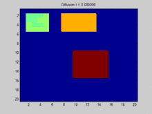 This section shows an example of a function diffusing over time through a graph. The graph in this example is constructed on a 2D discrete grid, with points on the grid connected to their eight neighbors. Three initial points are specified to have a positive value, while the rest of the values in the grid are zero. Over time, the exponential decay acts to distribute the values at these points evenly throughout the entire grid.
