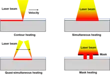The laser beam energy can be delivered to the required areas through a variety of configurations. The four most common approaches include: contour heating, simultaneous heating, quasi-simultaneous heating, and masked heating.