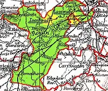 The parish of Lasswade is bounded on the north by the City of Edinburgh (namely the former parishes of Colinton and Liberton), on the east, by Dalkeith, Newbattle, Cockpen and Carrington, on the south by Penicuik and on the west by Glencorse. It extends about 7 miles from north to south and its greatest breadth is about 6 miles.[5] Prior to 1633 the north-east salient of the parish, around Melville Castle, formed the separate parish of Melville and Lugton.[6]